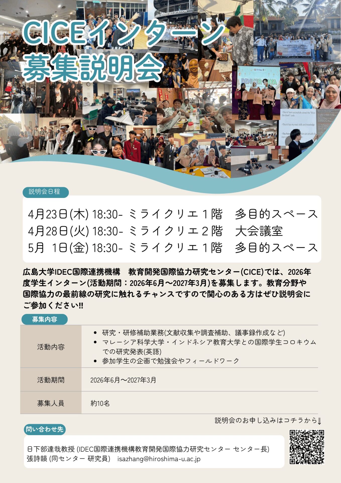 教育開発国際協力研究センター(CICE)は、2026年度インターンを募集します。採用された学生は、一年間、インターンとしてセンターの研究・研修補助業務についていただき、研究力、語学力、国際プロトコルをはじめとする国際交流スキル習得を目指します。また、2026年度の長期休暇中に開催する「インドネシア教育大学-マレーシア科学大学-広島大学 国際学生コロキウム」(インドネシアで、1週間ほどの開催を予定)を、主体的に企画運営し、発表者として参加します。コロキウムでは、自らの研究テーマを英語で発表・討議することを通して、国際的な舞台での企画力・実践力も培います。その他、参加学生による自主的な企画で、勉強会やフィールドワークなども実施しています。関心がある方はぜひご応募ください!